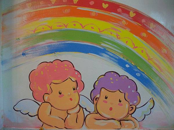 拉斐爾有名的壁畫裡2個小天使,飛來悅來居的客廳裡了~Q版的臉蛋,再添上一抹彩虹,好可愛啊!!!
