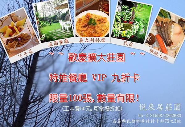 悅來居擴大莊園~推出餐廳&民宿VIP九折卡